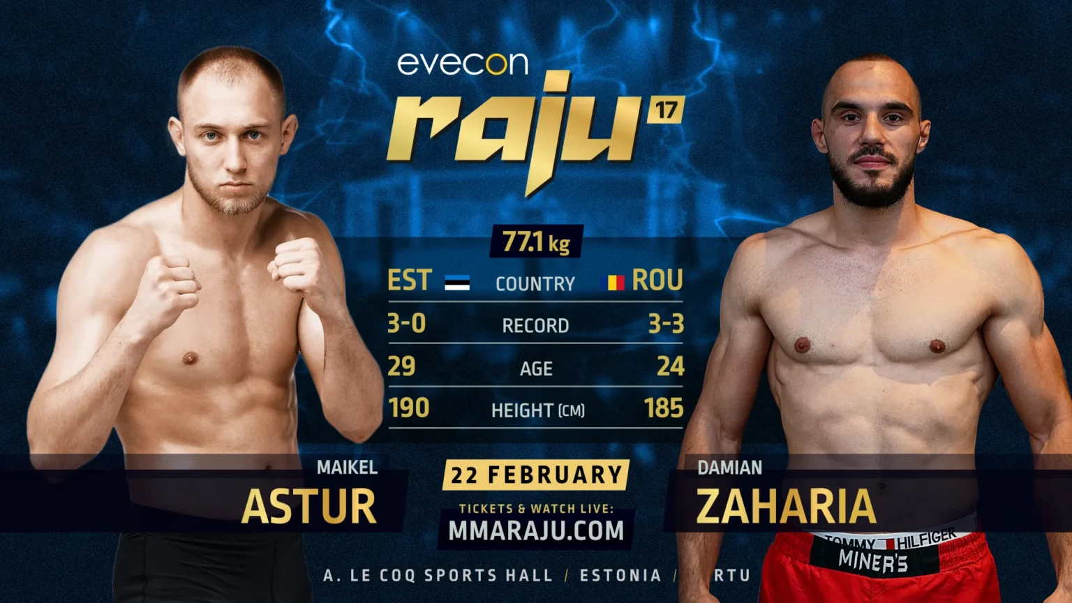 “Maikel Astur is proving himself as one of Estonia’s top MMA prospects, but Zaharia’s finishing ability is something we cannot ignore. This is a matchup that could steal the show,” said Ott Tõnissaar, CEO & Head Organizer of Evecon RAJU.